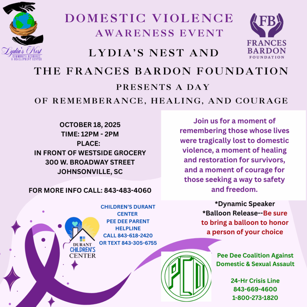 Join us for a moment of remembering those whose lives were tragically lost to domestic violence, a moment of healing and restoration for survivors, and a moment of courage for those seeking a way to safety and freedom. October 18,202512PM – 2PMIn front of Westside Grocery300 W. Broadway StreetJohnsonville, SC For more info, please call:…